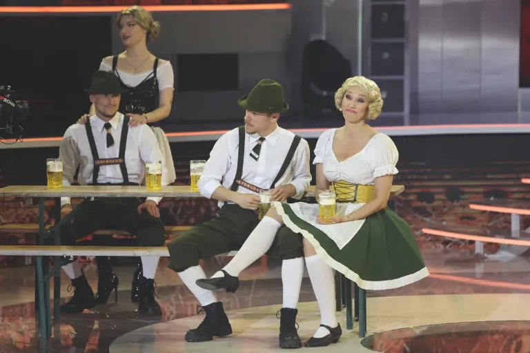 Az egész produkció hangulata a híres bajor sörfesztiválok világát idézte meg, ahol a vidámság, a túlzás és a látványos elemek szinte kötelező kellékek. A színpadon megjelentek a hatalmas söröskorsók, a harsány díszletek és a jól ismert, kissé túlzó vizuális elemek, amelyek az Oktoberfestek hangulatát hozzák közel a nézőkhöz. A jelmezek is ennek megfelelően készültek: feltűnőek, játékosak és kifejezetten figyelemfelkeltők voltak.
