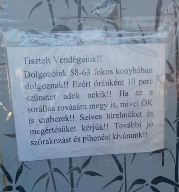 Ehhez hasonló dolog ihlette meg az egyik balatoni lángos bódé tulajdonosát is, aki az alábbi dolgot írta ki a vendégek számára: Egy főnök, aki őszinte a vevőkhöz. És emberséges a dolgozóival.