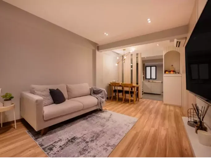 Minimalista letisztult nappali, háttérben a konyha és egy külön étkező